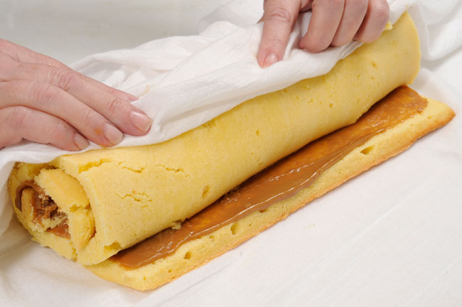 Espalhe o recheio pronto e enrole a massa com ajuda do pano.